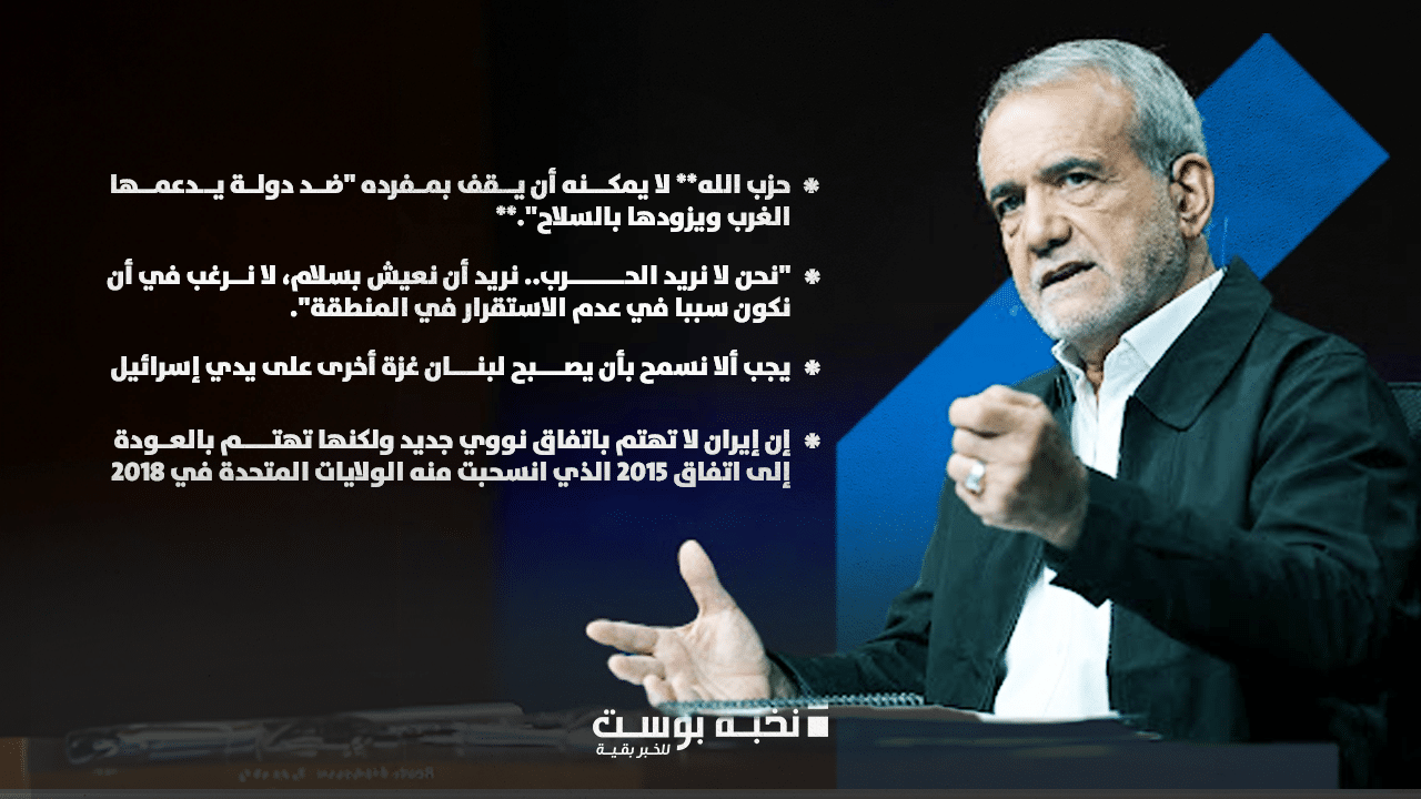 إذ أشار بزشكيان إلى أن حزب الله لا يمكنه أن يقف بمفرده “ضد دولة يدعمها الغرب ويزودها بالسلاح”.
